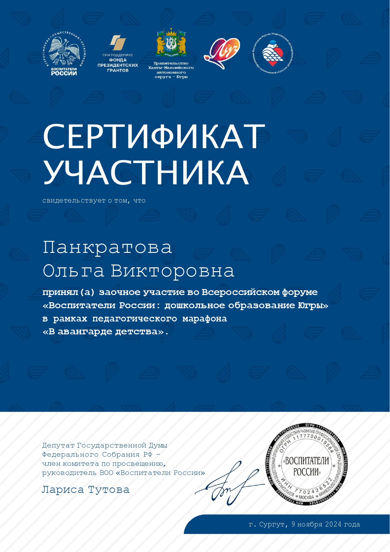 | 09.11.2024 | Всероссийский форум Воспитатели России | 2 | Сертификат |