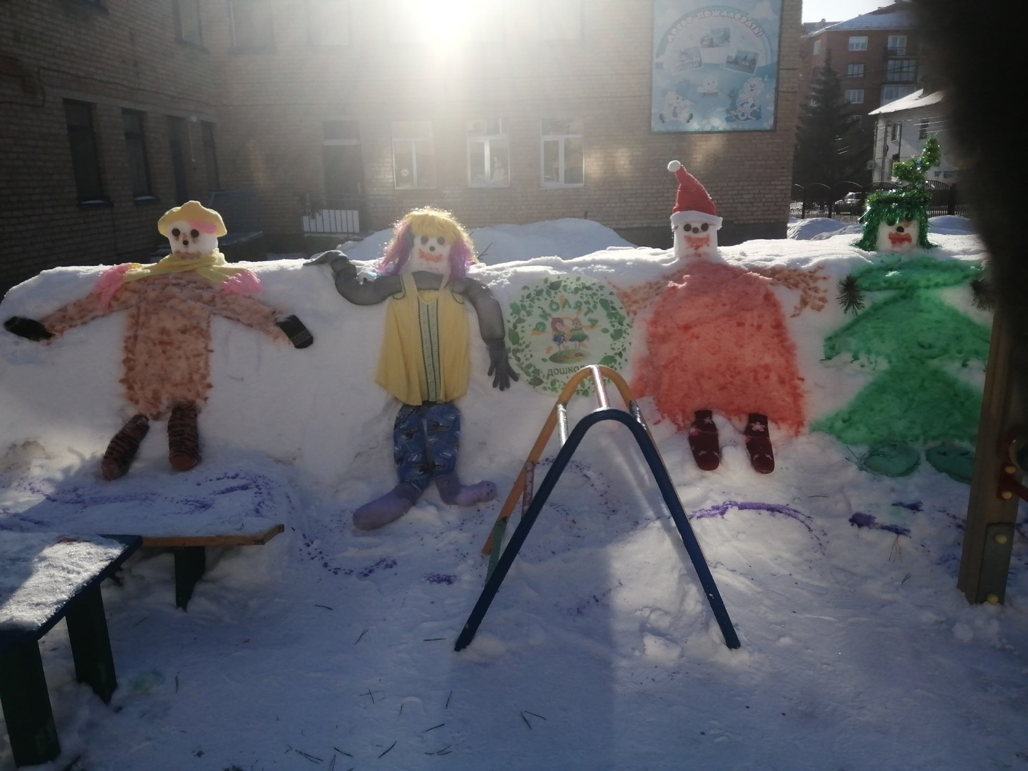 На участке в "Снежном городке" детей встречают сказочные герои - Эколята (Умница, Шалун, Тихоня, Ёлочка). Они предлагают покормить птиц, поиграть с мячами и попасть в цель, пройти через препятствие и побегать по лабиринту.Снежный городок вызывает у ребят положительный эмоциональный настрой, желание идти на прогулку, чтобы навестить своих сказочных героев. Снежные постройки способствуют не только физическому развитию детей, но и положительному эмоциональному настрою на двигательную активность во время прогулки.