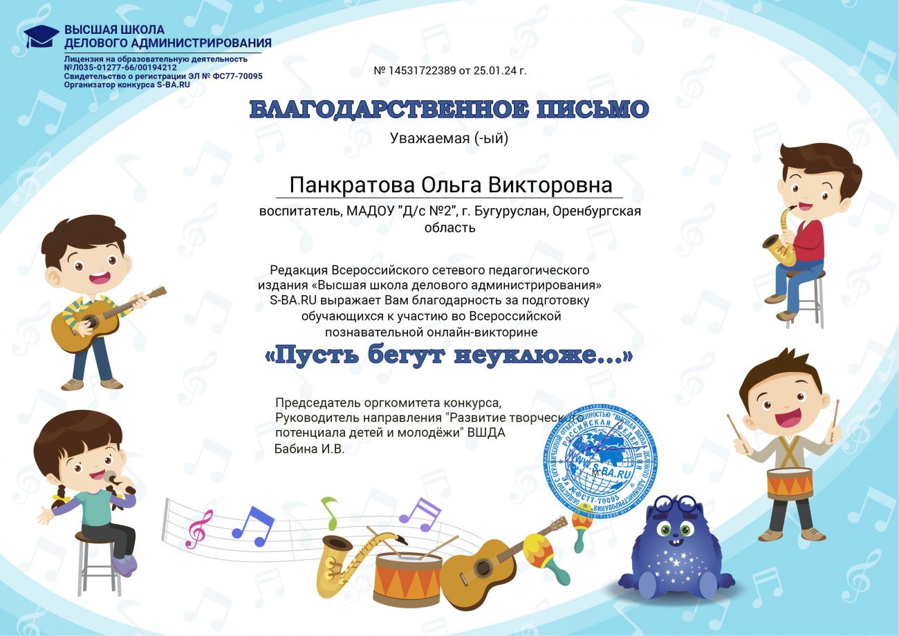 Благодарственное письмо от портала "Совушка" |